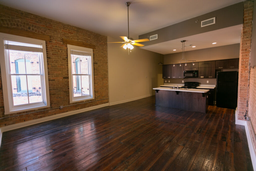 The Printing Press Lofts combines historic craftsmanship with modern living. These one-bedroom apartments feature original hardwood floors, oversized windows, and exposed brick walls. In addition, each unit includes luxurious features such as modern appliances and in-unit washers and dryers.