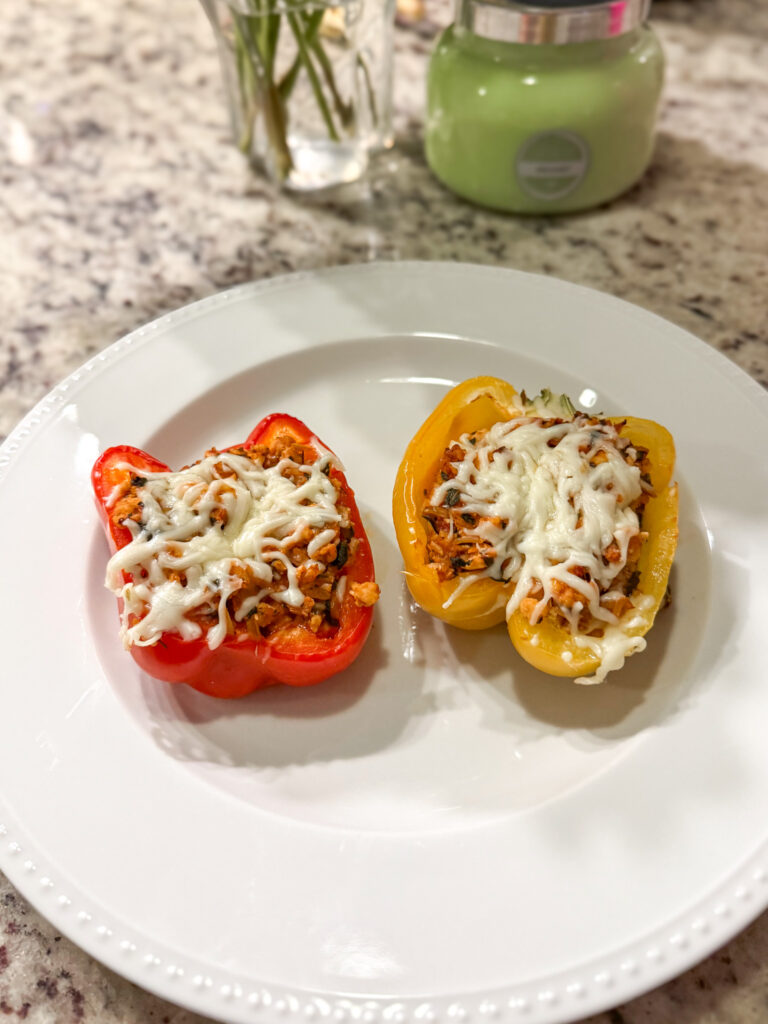 - Stuff the pepper halves with the filling and place them in a 9×13 casserole dish.