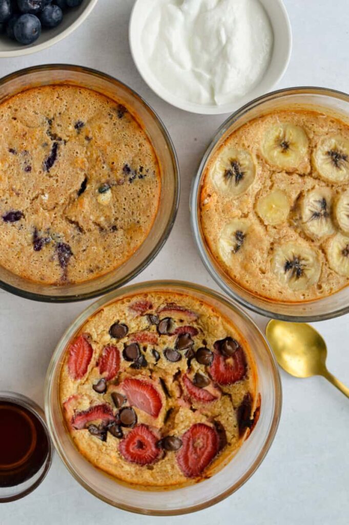 - Once smooth, top with desired toppings. Bake for about 30-35 minutes (or until a toothpick inserted into the center of the pancake bowl comes out clean).